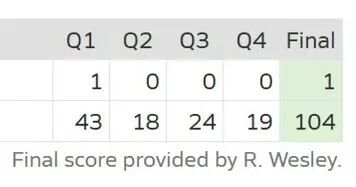 可如果我告訴你,有一支隊(duì)伍整場比賽都只拿了1分,與此同時卻讓對手得了104分,你會作何感想?這是真的,這支隊(duì)伍除了在首節(jié)得到一分之后,全場比賽再無任何分?jǐn)?shù)進(jìn)賬。